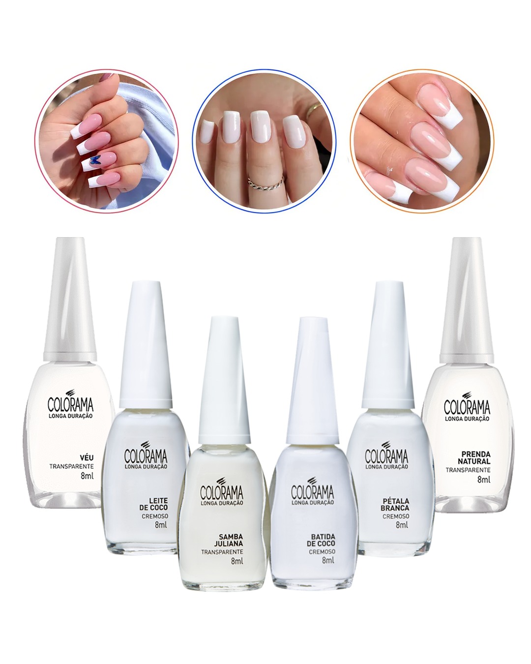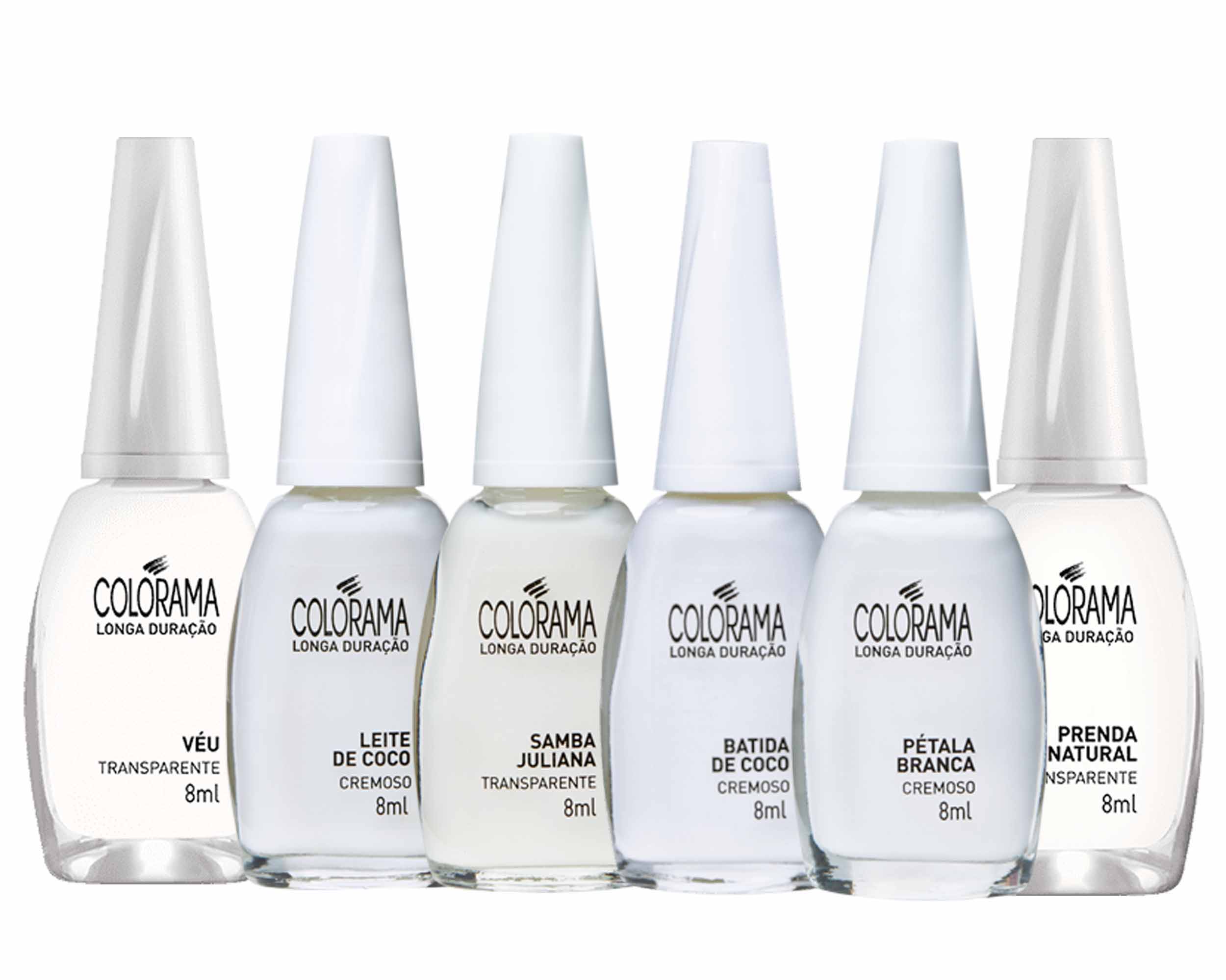 O Kit Brancos Colorama reúne 6 esmaltes icônicos que vão do transparente ao branco intenso, garantindo opções para todos os gostos e ocasiões.